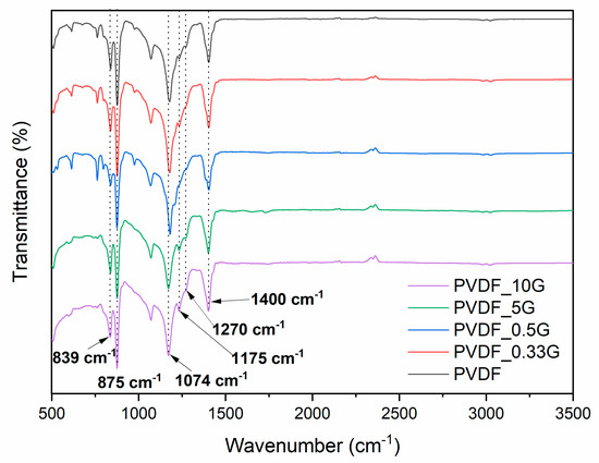 Figure 3 presents the FTIR spectra of all fabricated membranes. In general, pristine PVDF and graphene nanocomposite membranes revealed the same typical absorption bands and basic structural characteristics of PVDF. The strong peaks at 839, 875, 1074, 1175, 1270, and 1400 cm−1 correspond to CH2 rocking and CF2 asymmetric stretching, C—C asymmetric stretching, C—C asymmetric stretching, CF2 symmetric stretching, CF out-of-plane deformation, and CH2 wagging vibration, respectively [31,32]. This means that the addition of graphene did not produce any change in the membrane characteristics in terms of the crystalline phase. Particularly, an additional weak signal was observed for composites at 1730 cm−1.This represents the C=O stretching of the carbonyl and carboxylic groups present on the graphene sheets [33]. Thus, this confirms the successful incorporation of nanofiller inside the PVDF matrix.