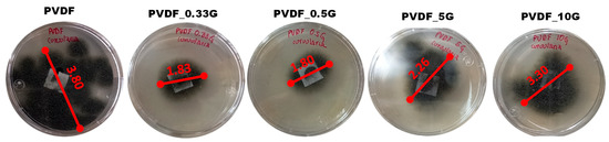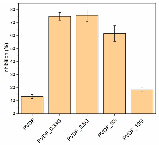Figure 5 shows the inhibition percentage against Curvularia sp. fungal strain after 72 h. The best growth inhibition was achieved by PVDF_0.33G and PVDF_0.5G membranes, with an inhibition percentage of 74.9% and 75.7%, respectively. PVDF_5G exhibited a slightly lower inhibition percentage, reaching 61.7%. Such obtained values are in the range of studies evaluating the antibacterial properties of graphene-based materials against E. coli, S. aureus [36], and B. subtilis [37], with values between 60% and 99%. Pristine PVDF and PVDF_10G presented very weak antifungal activity in comparison with other samples. In general, there is a clear antimicrobial effect of the graphene when incorporated into PVDF membranes, as illustrated in Figure 6.
