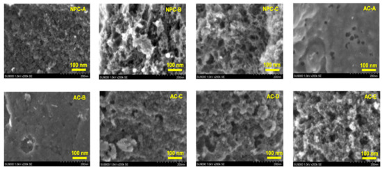 The characteristics of the porous carbon adsorbents including the three NPCs (NPC-A, NPC-B, and NPC-C) and the five ACs (AC-A, AC-B, AC-C, AC-D, and AC-E) are summarized in Table 1. All the adsorbents had a relatively similar particle size, ranging from 0.23 to 0.5 mm in diameter. The BET surface areas of the NPCs (376–960 m2/g) were less than those of the ACs (1016–1958 m2/g). The SEM images of the adsorbent surfaces at a magnification of 200k are shown in Figure 1. NPC-B, NPC-C, AC-D, and AC-E had rough surfaces whereas NPC-A, AC-A, AC-B, and AC-C had relatively smooth surfaces. Moreover, all the porous carbon adsorbents had a negative charge at the pH range from 6.0 to 7.1 (Table 1). There was no clear difference in the zeta potential between the NPCs (ranging from −13 to −34 mV) and the ACs (ranging from −6.3 to −43 mV).