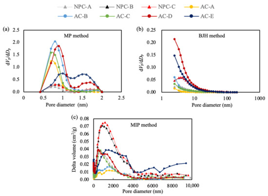 The pore size distributions of the porous carbon adsorbents were determined by different analysis methods including the MP, BJH, and MIP methods (Figure 2). All the adsorbents generally displayed three similar peaks at approximately 0.8, less than 3, and 200–4500 nm, except for AC-D and AC-E (Figure 2). AC-D had one additional peak at approximately 1.6 nm whereas AC-E had two additional peaks at approximately 1.6 and 26–100 nm. The peak heights clearly differed among the adsorbents. Unlike the ACs, which had higher peaks at small pore sizes (approximately 0.8, 1.6, and less than 3 nm), NPCs (NPC-B and NPC-C) had higher peaks at large pore sizes (200–4500 nm). More specifically, the peak for each adsorbent occurred at 1000 nm for NPC-B and NPC-C, 650 nm for NPC-A and AC-C, 1400 nm for AC-E, 650 nm and 1400 nm for AC-D, and 300–2000 nm for AC-A and AC-B.