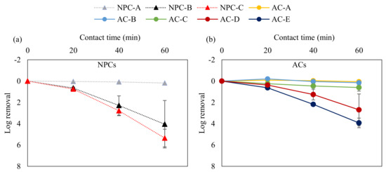 Removal of MS2 by NPCs (a) and ACs (b) at different contact times (0, 20, 40, and 60 min). Error bars indicate the standard deviation (n = 3).
