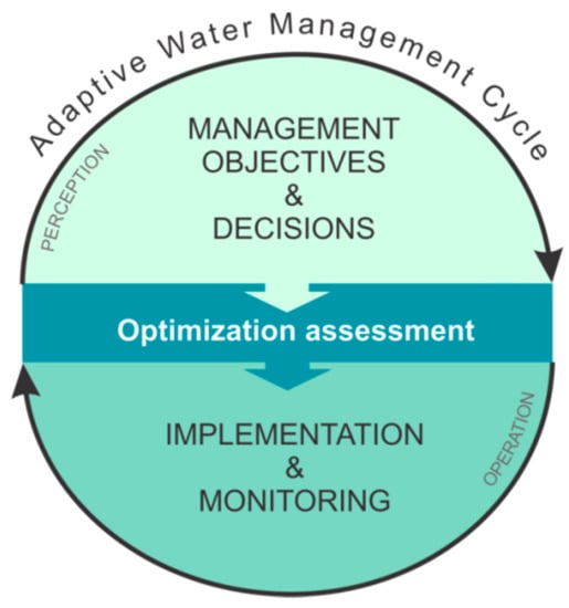 Position of the optimization assessment within the Adaptive Water Management Cycle. The phases of an AWMC can be divided into two main stages belonging to opposite edges of the action spectrum: perception–understanding and operational. The first stage involves the definition of the management objectives and management decisions; the second stage focuses on the implementation and monitoring of the management actions to provide insight into the next cycle, respectively.