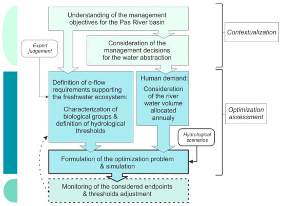 The optimization assessment framework presented in this study represents the “structured set of steps and considerations used for the formulation [of the optimization problem]” [44] underpinning the optimization modeling exercise conducted for the case study of the Pas River, Northern Spain (Section 2.2).