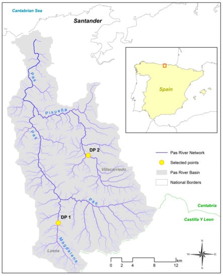 We used the Pas River basin in Northern Spain as the case study area for the optimization assessment development and application (Figure 3). The Pas River represents an ideal catchment to show the potential of optimization approaches to support adaptive water management planning. It subject to relatively strong human pressure, while it still provides a good representation of its potential natural condition. In this regard, most of its river water bodies show a good ecological status (sensu European Water Framework Directive; [48]) and provide habitats for iconic species for conservation such as Atlantic salmon. The Pas River system drains into the Cantabrian Sea (North–East Atlantic). Calcareous rock and sandstone formations dominate the basin which covers an area of 649 km2. The river network is defined by the three main rivers Pas, Pisueña, and Magdalena. The mean annual precipitation amounts to 1300 mm, and the mean annual daily flow (close to the river mouth) is 14 m3/s. Maximum flows are observed in April, and minimum discharges occur in September [49], close to the mouth. Water regulation in the basin is mainly implemented through surface water uptake by cross-channel weirs and pump injection into the water supply grid. A primary management objective is domestic water supply: water is mainly abstracted to satisfy the demand of the municipalities with annual volumetric allocation for the distinct municipalities. While there are no large infrastructures (e.g., dams) able to modify high flow and flood patterns, water diversion operations and water use can still influence the hydrological attributes related to low flows (e.g., magnitude of low flows, duration of droughts). Extended shoals and changes in the river flow as a consequence of traditional diversion practices represent a threat to ecosystems and freshwater biota. The ecological conditions of the aquatic ecosystem in the basin are monitored and defined by the Cantabrian Hydrological Confederation (CHC) which is also responsible for the drafting and development of the Basin Management Plans. In this study, we considered, as a setting for the optimization of water abstraction for municipal use, two distinct diversion points (i.e., DP1 and DP2)—as consumptive demand for the points we considered were 0.26 Hm3/year and 0.66 Hm3/year, respectively. Both points are not impacted by prior upstream flow diversion along the river network located on two distinct river segments (sensu [44]).