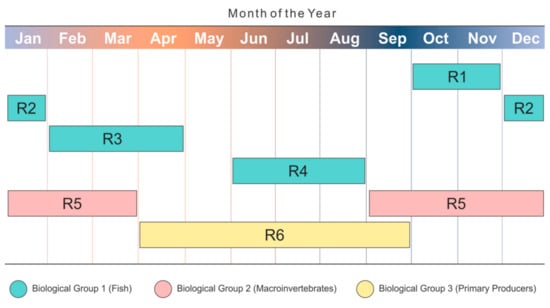 The optimization of water diversion based on environmental needs requires the definition of reference hydrological conditions to ensure the conservation of key flow attributes (e.g., base flows, pulses) that support the ecosystem. Knowledge of the exact hydrological conditions for species and their cross-scale variation remain a core research gap in the field of freshwater biology [50]. Despite this gap, water management optimization assessment relies on flow–ecology relationship assumptions or eco-hydrological indicators (e.g., [51,52,53,54]) for the identification of optimal management strategies that facilitate the implementation of an adaptive management approach at appropriate scales [55]. E-flow requirements need to reflect hydrological conditions that support ecological processes and functions. A generalized optimization assessment approach considering a single taxonomic group (e.g., fish) can expose the risk of adverse effects on other components of the ecosystem and lead to unpredictable ecological results both at the short- and long-term scales [8,56]. Thus, the acknowledgment of the role of each biological group in the ecological framework is “fundamental to the maintenance of diverse and resilient communities into the future” [56]. In the frame of the study, despite not explicitly considering existing direct and indirect relationships among the considered biological groups, we simultaneously included the hydrological conditions of different biological groups to define the e-flow requirements in the Pas River throughout the year (Figure 4). In this regard, we encompassed three biological groups (Biological Group 1, 2, and 3) within the relevant levels of the trophic network of the ecosystems (from primary producers to apex predators). The process of e-flow requirement (R) definition (i.e., hydrological conditions for the biological groups) was based on the output of a workshop with a group of experts in the fields of hydrology, eco-hydrology, and freshwater biology from the IHCantabria (Santander, Spain). The e-flow requirements considered in this study are not absolute, meaning that they can be refined based on the dominant situation and idiosyncrasy of each watershed (establishing definitive values was out of the scope of this work). A summary of the requirements is shown in Table 1.