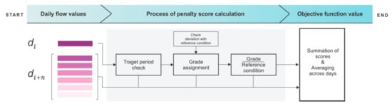 To identify the highest water supply sustainability in the river basin, the magnitude and timing of river water diversion operations need to be optimized to comply with the considered e-flow requirements. Hence, the latter generally constrains the availability of water for human consumption. Constrained multi-objective optimization is an optimization method based on the search for feasible solutions that directly limit the search space [71]. This method is frequently applied in real-world settings of structural and operational optimization assessments for water regulation assets [72,73]. An approach for constrained optimization is represented by the penalty-based approach; it allows transforming the problem into an “unconstrained” one—penalty (constraint) is incorporated into the objective function to reduce the fitness of the function based on the degree of the specified violation. The penalty-based approach particularly suits optimization assessments considering the high number of limiting conditions. Moreover, it can be easily implemented with evolutionary/genetic algorithms [74,75,76]. In this study, the maximization of the conservation potential of the hydrological conditions for the biological groups and the satisfaction of the yearly municipal water volume demand are considered in the formulation of the problem functions as conflicting objectives. For each e-flow requirement objective, a penalty score method based on the characteristics of the requirement was defined and incorporated into the objective function. The calculation of the penalty score and the objective function varied based on the type of requirement. The general structure of penalty score and objective function calculation process is shown in Figure 5, while the detailed functions used in the optimization problem are available in Appendix A. Considering the specific case of river flow diversion, the requirements were specified as thresholds for the river flow component modification. A flow condition above the threshold will be always favored by the algorithm, while a hydrological condition below the defined threshold will be penalized based on the degree of the violation. Each function output was normalized based on the characteristics of each requirement, with scaling between zero (i.e., the best outcome) and one (i.e., the worst one).