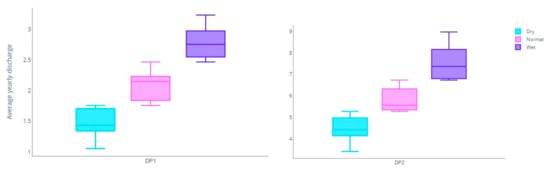 Average yearly discharge values (in m3/s) for the considered scenarios (i.e., dry, normal, and wet) for the two diversion points DP1 and DP2. The upper and lower fences represent the maximum and minimum discharge vales, the edges of the box represent the upper and lower quartiles, and the line inside the box is the median.