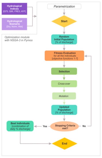 Optimization problem structure employed to the Pas River. The main box shows the module structure of the Non-Sorted Genetic Algorithm-3 (NSGA-3) in Pymoo—a multi-objective optimization module in Python [81]. Two external modules, Hydrological Scenario and Hydrological Indices, calculated the hydrological scenarios to be inputted into the Pymoo module and the hydrological variables, respectively.