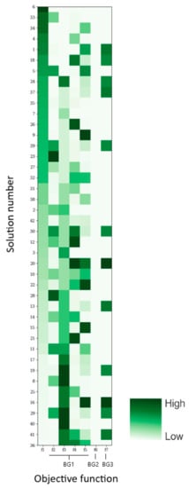 Heatmap showing the sorted normalized objective functions scores (on the y-axis) for the e-flow requirements (BG1 = Biological Group 1; BG2 = Biological Group 2; BG3 = Biological Group 3) in relation to the municipal water supply objective (f1) (on the x-axis). Tile hue indicates the score (dark green = high/best scores; light green = low/worst scores). Presented result is for run #1 for DP1, dry scenario.