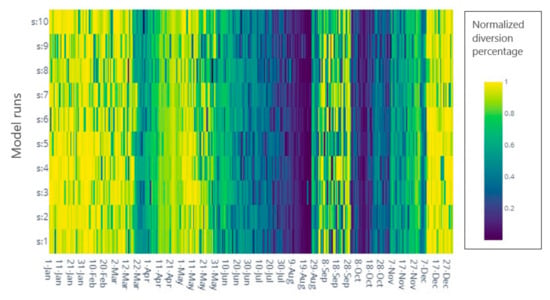 Comparison of the results for each run of the optimization model showing the pattern of the normalized average daily diversion percentage values (expressed as the daily percentage of the natural daily discharge). Yellow (1) tiles correspond with the highest daily percentage, whereas blue (0) tiles correspond with the lowest optimal daily diversion. Presented results are for the DP1 under the dry scenario.