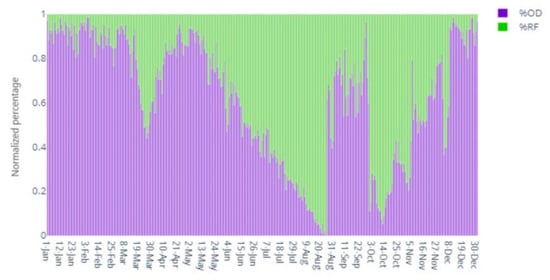 Comparison between the residual percentage of natural daily flow (green—%RF) remains in the river and the average daily discharge optimized for diversion (purple—%OD). The diverted discharge was calculated as a daily average for all 10 runs of the model. Presented results are for the DP1 under the dry scenario.