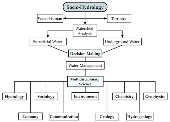 In this science development, other terms related to socio-hydrology have emerged, such as the socio-hydrological system (SHS), defined as a set of water resources whose flow and use are controlled by a composition of hydrological cycles and a social system [29]. Another term is integrated water resources management (IWRM), a social process that relates hydrology to society [30]. In 2015, the term socio-hydrogeology was introduced, defined as “a way of incorporating the social dimension into hydrogeological investigations” [31]. Socio-hydrology is considered a multidisciplinary field, which includes the dynamic reactions and interactions between water and people [32]. The definition of the term and its relationship with other sciences is described in Figure 1.