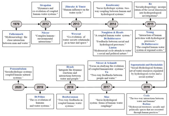 In Figure 2, the evolution of the definitions of the term socio-hydrology is presented, recorded in a scientific publication in 1979, attempting to create a nexus between social aspects and water, considering the demand of social groups for water resources, relating them to the existence of ancestral knowledge of the communities regarding water management [42]. In 2012, publications concerning this issue took on greater strength. In 2015, the term socio-hydrogeology appeared, from this moment on being a constant in scientific publications that address water with special consideration of the human aspect. These interactions are bi-univocal and leave teachings, techniques, and a new vision for the integral management of water.
