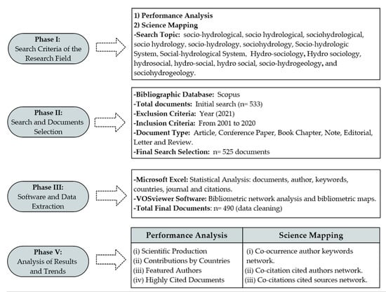 The data collection was carried out in January 2021 using a series of descriptors related to the term socio-hydrology, contained in the title, abstract, and keywords, together with Boolean logical functions (AND, OR), which allowed the search to be carried out: (Topic Search) TS = (TITLE-ABS-KEY (“socio-hydrological”) OR TITLE-ABS-KEY (“socio hydrological”) OR TITLE-ABS-KEY (“sociohydrological”) OR TITLE-ABS-KEY (“socio hydrology”) OR TITLE-ABS-KEY (“socio-hydrology”) OR TITLE-ABS-KEY (“sociohydrology”) OR TITLE-ABS-KEY (“Socio-hydrologic System”) OR TITLE-ABS-KEY (“Social-hydrological System”) OR TITLE-ABS-KEY (“Hydro-sociology”) OR TITLE-ABS-KEY (“Hydro sociology”) OR TITLE-ABS-KEY (“socio-hydrogeology”) OR TITLE-ABS-KEY (“sociohydrogeology”) OR TITLE-ABS-KEY (“hydrosocial”) OR TITLE-ABS-KEY (“hydro-social”) OR TITLE-ABS-KEY (“hydro social”)). We obtained 533 documents as an initial search result.