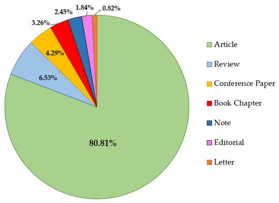 In the database’s construction, several implicit and explicit selection criteria must be met for the documents obtained [43]. As the first criterion, we considered using articles, book chapters, reviews, editorials, letters, and notes [76]. Additionally, since this is a relatively new topic, all languages were considered, so we wanted to explore its progress over time fully [77]. As the second criterion, it was decided to exclude the year 2021, as it is the current year, obtaining 525 documents.