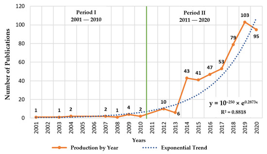 Additionally, scientific production was evaluated using Price’s law [103]. This law evaluates the increase in research in the field of study by showing exponential growth [81,104,105]. The entire production of the study field was estimated, and an exponential growth model was generated (see Figure 5). The equation y = 10−250 × e0.2873x was obtained, where the value of R2 = 0.8818 verifies that the field of study is in exponential growth.
