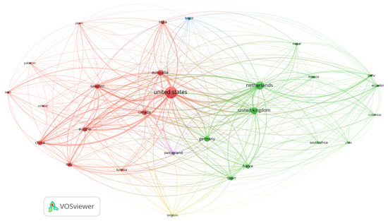 Figure 6 shows the analysis of bibliographic coupling by country. Nodes represent these countries, and the proportion of their size is a function of the number of documents. The lines that join the nodes (links) represent the interconnection between countries, showing their strength of collaboration, the more comprehensive the line, the greater the relationship’s strength. The figure shows 28 countries grouped in five colour clusters and 750 links, with a relationship strength of 399,986. The most outstanding node is the United States of America, with 171 documents and 3009 citations, followed by the Netherlands, with 83 documents and 2237 quotes.