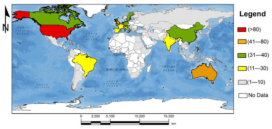 In Figure 7, the map includes the 71 leading countries that have contributed to socio-hydrology. Colours distinguish them according to the number of publications on the subject. In white are observed countries without publications on the subject.