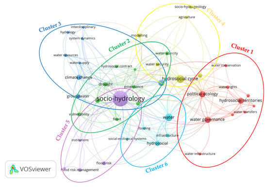 The visual and multidimensional representation was carried out through VOSviewer software [84,123]. A total of 1401 keywords were obtained; 44 of them have a co-occurrence of at least five times. In Figure 8, six clusters are shown, exposing 43 nodes, 203 links, and a total link strength of 396. The term socio-hydrology has 134 occurrences, a relationship with 34 terms, and the most relevant word in cluster 5 (purple). Supplementary Materials Table S1 shows the co-occurrence of the author keyword network with the six clusters.