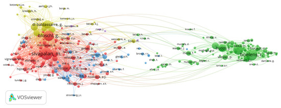 This type of analysis allows investigating the discipline’s bases to show the evolution of the field of study with a quantitative approach [149,150]. The network allows observing the authors who support the intellectual structure and who visually stand out on the network [43,151].