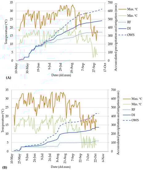 Trends of daily maximum (Max.) and minimum (Min.) air temperature (°C), and accumulated precipitation and irrigation (mm) for the growing seasons, dated 5 May 2018–17 October 2018 (A) and 5 May 2019–11 November 2019 (B).