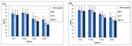 Effect of water supply treatments on relative chlorophyll content (expressed as SPAD values) of cultivars in 2018 (A) and 2019 (B) growing seasons. The data represents the average values of both years ± SD. The values showing different letters are significantly different at p ≤ 0.05 using the post-hoc HSD test. RF, rain-fed; DI, deficit irrigation; OWS, optimum water supply; HET, Hetényi Parázs; UNIK, Unikal; UNIJ, Unijol; HAB, Habanero.