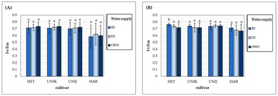 In the second growing season (Figure 3B), HET had significantly (p = 0.021) lower Fv/Fm values in DI and OWS when compared to RF (F = 10.101, p < 0.001). Among the other cultivars (UNIK, UNIJ, and HAB), Fv/Fm values of water supply treatments were not significantly different from each other. Nonetheless, it was detected that as water supply in HAB, values tendentially increased (F = 2.537, p = 0.085).