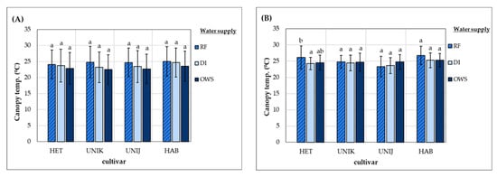 On the effect of water supply treatments, in the 2019 season (Figure 4B), HET had a significantly (p = 0.001) lower response to canopy temperature under DI and OWS conditions when compared to RF. Water supply had no influence on UNIK, UNIJ, and HAB. Notwithstanding, as water supply increased, canopy temperature increased in UNIJ, but on the contrary, that of HAB decreased even though there were no significant differences in them.