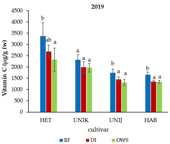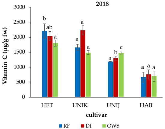 According to [40], vitamin C can be found in fully matured peppers and contribute essentially to human nutrition and health [41]. Based on the findings, water supply treatments significantly (p < 0.05) influenced vitamin C content in the chili pepper cultivars (Figure 5). Under RF conditions, a high amount of vitamin C was found in HET in 2018 (2204.2 ± 240.7 µg/g) and an increase in UNIK under DI conditions (2229.4 ± 146.3 µg/g). Similarly, an increase in vitamin C was found in UNIJ, but in HAB, water supply had no influence on their low amount (668 ± 163.7 µg/g).