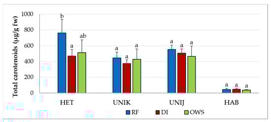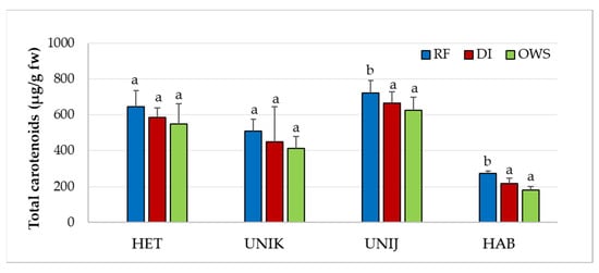 Effect of water supply on total carotenoid concentration in the 2018 season. The means are expressed in µg/g fresh base weight ± SD (n = 4). RF, rain-fed; DI, deficit irrigation; OWS, optimum water supply; HET, Hetényi Parázs; UNIK, Unikal; UNIJ, Unijol; HAB, Habanero.