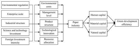 Using human, material, and natural capital builds the basic elements of chemical industry growth. Environmental regulation, enterprise scale, science and technology investment, foreign investment intensity, and industrial structure will also directly or indirectly affect the basic elements of economic growth, such as human capital, material capital, and natural capital. The papermaking enterprises rely on these elements, through environmental costs, technological innovation, product structure, management level, and resource allocation, thus affecting the green development of paper industry development efficiency [21,22]. Strict environmental regulation helps papermaking enterprises increase investment in scientific and technological innovation; improve production technology and process; and reduce raw material, energy consumption, and pollution emissions, to improve green development efficiency. However, the tightening of environmental regulations may also lead to the disappearance of “environmental dividend” of papermaking enterprises [23], the increase of environmental costs, and the narrowing of scientific and technological innovation investment [24]. On the contrary, this event leads to insufficient investment in enterprise innovation funds and inhibits enterprise technological innovation, thereby restricting the improvement of green development efficiency of the paper industry. The result is that enterprises’ innovation capital is insufficient, and the technological innovation of enterprises is restrained, thereby restricting the improvement of green development efficiency of the paper industry. Large-scale papermaking enterprises have sufficient funds, rich reserves of scientific and technological talents, technological solid innovation ability, high management level, and resource allocation ability, which can cope with the negative impact of the environmental costs’ increase. The increase of regional science and technology investment will bring additional financial support for papermaking enterprises’ innovation and enhance the research and development ability and scientific and technological output of enterprises.