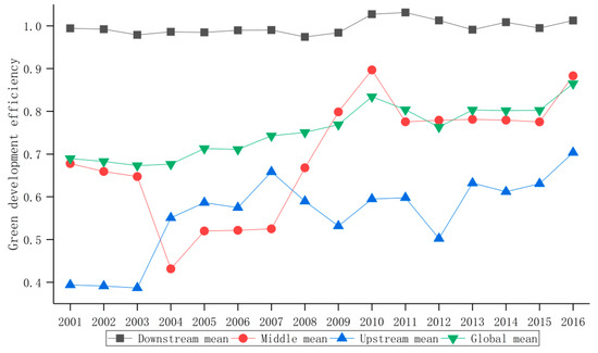 From 2001 to 2016, the overall green development efficiency of the paper industry in the Yangtze River Economic Belt showed an upward trend in fluctuations (Figure 2). The green efficiency of the paper industry increased from 0.6895 in 2001 to 0.8648 in 2016, with an increase of 0.1753. The annual average geometric growth rate was 1.70%, and the efficiency loss gap was 13.52%. The data show that although the green development efficiency of the paper industry in the Yangtze River Economic Belt has been steadily improved, the overall level is still not high, and the promotion potential is enormous.