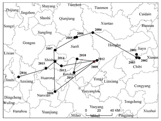 From 2001 to 2016, the green development efficiency center of the paper industry was distributed in Hunan Province and Hubei Province in the middle reaches of the Yangtze River, moving 184.17 km to the southwest, with an average annual migration distance of 11.70 km. Thus, in the study period, the paper industry’s green development efficiency in the southwest of the Yangtze River Economic Belt has been improved (Figure 3).
