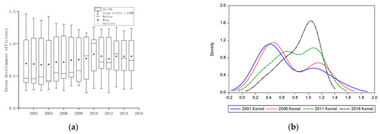 Box diagram (a) and kernel density diagram (b) of green development efficiency of the paper industry.