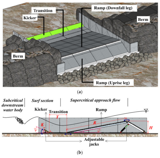Surfing on standing waves in rivers is a popular sport, but there are safety and availability issues associated with surfing natural river waves [1,2,3]. The first artificial structure to generate a surfable standing wave in a river was built in 1970 in Eisbach Canal in Munich, Germany [4]. However, while there are many studies in the literature on optimum design of surfboards (e.g., [5,6,7]), very little previous research has examined artificial surf waves. Most previous surf wave research has focused on ocean waves and how to form them [8,9,10]. Artificial reefs were initially built for coastal protection against erosion, but led to breaking ocean waves, thus were subsequently designed to form surf waves (e.g., [11,12]). One of the first research experiments in a flume physical model of a stationary surf wave investigated surfboard design for ocean waves [13]. In that research, an obstacle was exposed to supercritical flow to form a 0.18 m high breaking wave. Although results were not used to improve surfboard design due to scale effects and surface tension forces, they reported successful production of laboratory surf flows. Oertel et al. [14] combined flume experiments and computational fluid dynamics (CFD) to study a similar concept, i.e., an obstacle exposed to supercritical flow, for forming river surf waves. The volume of fluid (VOF) method and the re-normalization group (RNG) turbulence model were applied for numerical simulations and the breaking wave was simulated within an 80–95% accuracy with respect to physical model results. However, this method is not very common for generating river surf waves as it is often associated with safety problems due to presence of large deflector reefs. Another mechanism to form river surf waves is through sheet flows, in which a flap across the bed guides a high velocity sheet of flow upward, such as the Cunovo wave in the Danube River near Bratislava, Slovakia, where damages to surfboard fins are reported as a result of the sheet flow with low depth [15].