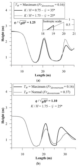 As mentioned above, depending on site considerations the highest feasible ramp is desired, thus in the present numerical experiments ramp height was kept constant at 1 m, since any higher ramp would have induced overbank flooding at the prototype. Nonetheless, a criterion is needed to attribute findings of this research to other sites where shorter or higher ramps are needed. A dimensionless group, () that correlates the ramp height to flowrate was evaluated as the similarity criterion. By keeping the constant, where H is higher or shorter than 1 m, a corresponding could be calculated. Figure 12 shows that if the structure height changes and all other geometric features such as ramp length, transition length, kicker length and tailwater depth are changed proportionally, and the scaled flowrate based on similarity of () runs over the structure, a similar, scaled wave profile is predicted. Flowrate adjustment can take place by constricting the river width or bypassing a portion of the flow. The average, point by point discrepancy, of profiles in Figure 12b is only 6.75%.