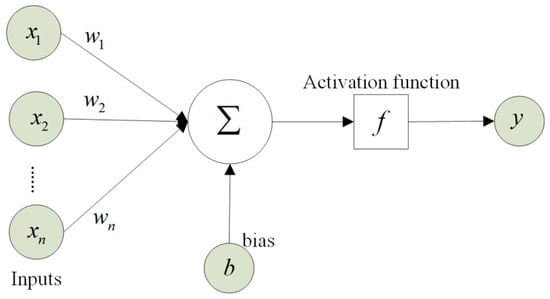 where is an output from the neuron, is the ith input to the neuron, is the connection weight of the ith input, b is the bias, and f is the activation function.
