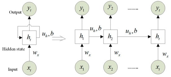 RNN is a class of ANNs developed for processing sequential data [29]. Unlike the traditional ANNs, RNN has recurrent layers in which neurons are connected (Figure 2). Hence, information from a neuron is transferred to the neurons in the same and next layers. As seen in Figure 2, RNN also has a hidden state to recall some sequence data. RNN computes new states by applying its activation functions to prior states and new inputs recursively. The hidden state value () at a time step t can be obtained via: