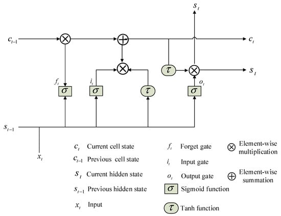 LSTM was first presented by Hochreiter [31]. LSTM is a class of RNN, which was developed for learning long-term dependencies. Each neuron in LSTM is a memory cell, which includes three gates: input gate, forget gate, and output gate to control the flow of information between different time steps (Figure 3). Unlike conventional ANNs, the LSTM cells generate two separate values by a series of activations and operations. One value is the cell state () that carries information and stores memory in the long term, and the other is the output of the hidden layer . When the number of inputs increases, the gradients to the first several inputs vanish and become equal to zero. The LSTM can solve this problem by using the internal gates that can add, edit, or remove information in the cell. The readers are referred to Tran et al. [32] for a detailed description of LSTM.