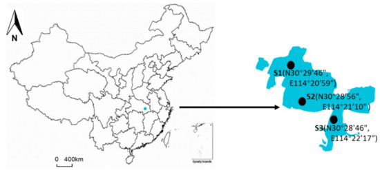 The location of three sampling sites in Lake Nanhu, Wuhan, China.