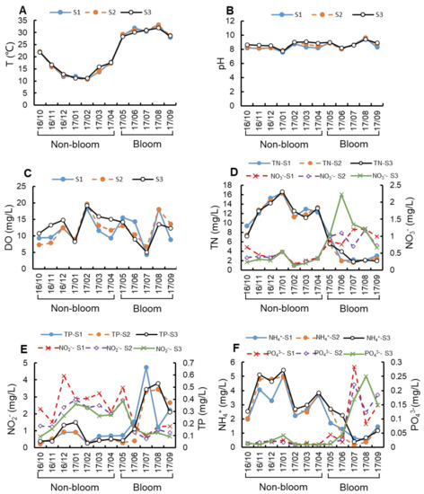 Variation of environmental conditions in Lake Nanhu during non-bloom and bloom period. Changes in temperature (A), pH (B), dissolved oxygen (C), total nitrogen (D), total phosphorus (E), nitrate (D), nitrite (E), phosphate (F) and ammonia (F) throughout the year.