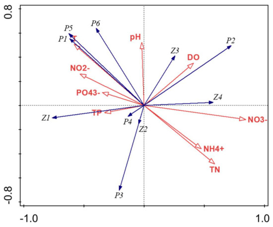 Redundancy analysis of plankton community composition and environment factors. T: Temperature; P1: Cyanophyta; P2: Pyrrophyta; P3: Crytophyta; P4: Bacillariophyta; P5: Euglenophyta; P6: Chlorophyta; Z1: Cladoceran; Z2: Copepod (Mesocyclops leuckarti); Z3: Rotifer; Z4: Protozoan.