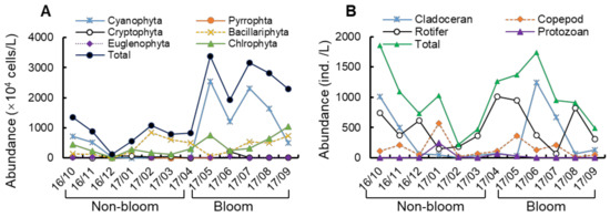 Variation of abundance on plankton in Lake Nanhu during non-bloom and bloom period. The density on phytoplankton (A) and zooplankton (B) in Lake Nanhu.