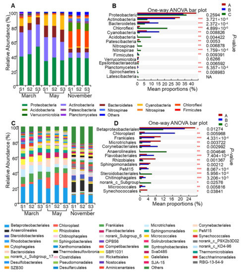 Community composition and relative abundance of bacteria. Classification structure and relative abundance in each water sample from Lake Nanhu (A) at the phylum level and (C) at the order level. At the specific level, “Others” means those that account for less than 1% of the total OTUs in each sample. In the overall distribution of bacteria at the phylum level (B) and at the order level (D) in each water sample, the bar graph represents the proportion of each bacterial phylum’s or order’s abundance in the samples. The difference in bacterial abundance was significant with a p-value of <0.05. * p < 0.05; ** p < 0.01; *** p < 0.001. S1, S2, and S3: surface water samples. (A–C) represent March, May, and November respectively.