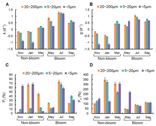 Variation of microzooplankton grazing on size specific phytoplankton (20–200 μm, 5–20 μm, and <5 μm) during non-bloom and bloom period. The (A) growth rates and (B) grazing rates of the three kinds of phytoplankton with different particle sizes. The grazing pressure of microzooplankton on size specific phytoplankton (C) standing stocks (Pi) and (D) primary productivity (Pp).