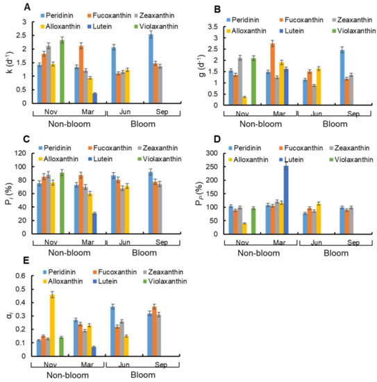 Pigment-specific phytoplankton growth rates were ranged from 0.37 d−1 to 2.54 d−1 (Figure 8A). Among them, the highest growth rate was peridinin (represented for Pyrrophyta) in September (bloom period, 2.54 d−1) and the lowest growth rate was lutein (represented for Chlorophyta) in March (non-bloom period, 0.37 d−1). According to Figure 8B, the grazing rates of microzooplankton on phytoplankton were 0.37 d−1–2.75 d−1. Microzooplankton showed highest grazing rate on fucoxanthin (represented for Bacillariophyta, 2.75 d−1) and lowest grazing rate on alloxanthin (represented for Cryptophyta, 0.37 d−1) both in non-bloom period.