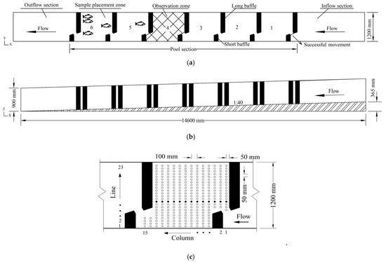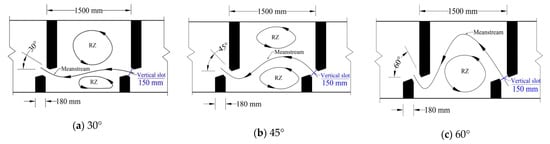 - Li, G.N.; Sun, S.K.; Zhang, C.; Liu, H.T.; Zheng, T.G. Evaluation of flow patterns in vertical slot fishways with different slot positions based on a comparison passage experiment for juvenile grass carp. Ecol. Eng. 2019, 133, 148–159. [Google Scholar] [CrossRef]
