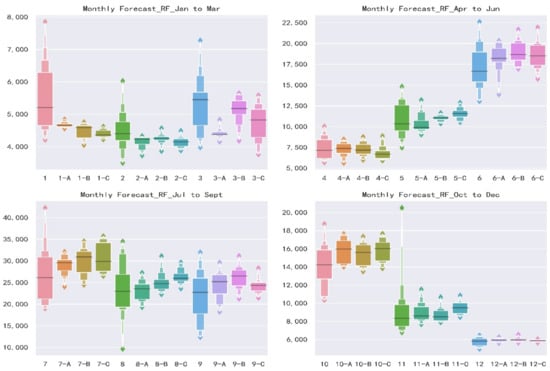 As shown in Figure 3, for the situation of different models with same predictors’ schemes, the accuracy in calibration of XGB is better than that of RF. Scatters in XGB are much closer the 1:1 line which means a perfect fitness. In the meanwhile, all the values on the scatterplots are evenly located at both sides of orange line, show little indication of system deviation. For another situation of same models with different predictors’ schemes, it shows a similar accuracy and adaptation. It is difficult to compare the performance of the Scheme A, Scheme B, and Scheme C from the graphs. The precision evaluation indexes are shown in the following Table 2 which contains the specific values towards three schemes and two monthly forecast models. Data in the table further verify the above conclusions.