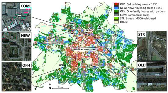 Selected monitoring catchments include an area of typical five-storey perimeter blocks built between 1870 and 1930 (OLD), a newer area of 4–8-storey concrete slab buildings built between 1960 and 1980 (NEW), a residential area characterized by one-family houses and villas with gardens (OFH), a commercial and industrial area of high imperviousness with large flat-roof buildings and yards (COM) and 1.3 km of a busy road including an intersection with traffic lights and bus stops (STR). An overview of the selected monitoring sites is shown in Figure 1. Selected monitoring catchments vary in size from 2.6 to 37 ha (total area) and are very homogeneous regarding the respective land-use type with an average areal ratio of 90% (Table 1).