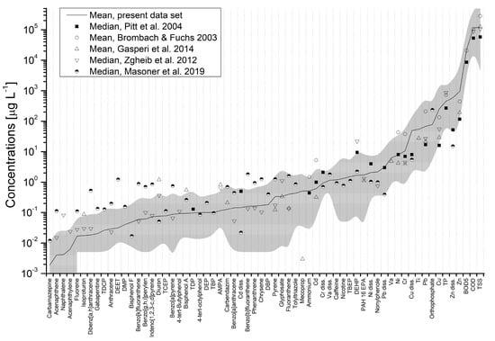 Generally, average concentrations of all samples compare well to large stormwater datasets by Brombach and Fuchs [] (means across 265 sites, global data base with focus on German data, described in []), Pitt et al. [] (medians across 3390 samples of storm events across the United States), Gasperi et al. [] (means of 3 urban catchments in France), Zgheib et al. [] (medians of 1 catchment with high number of analyzed substances in Paris, France), and Masoner et al. [] (median of 21 sites across the United States with high number of analyzed substances), as outlined in Figure 2. For example, EMC of TSS (mean: 124 ± 15 mg L−1, median: 71 mg L−1) are similar to the means/medians in the datasets above, of 282 mg L−1 (mean, []), 58 mg L−1 (median, []), 126 mg L−1 (mean, []) and 106 mg L−1 (median, []), respectively.